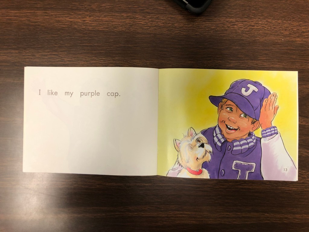 The student got to this page and read: I like my purple hat. The text reads: I like my purple cap. This is an Early level text with a pattern. I like my purple………………..